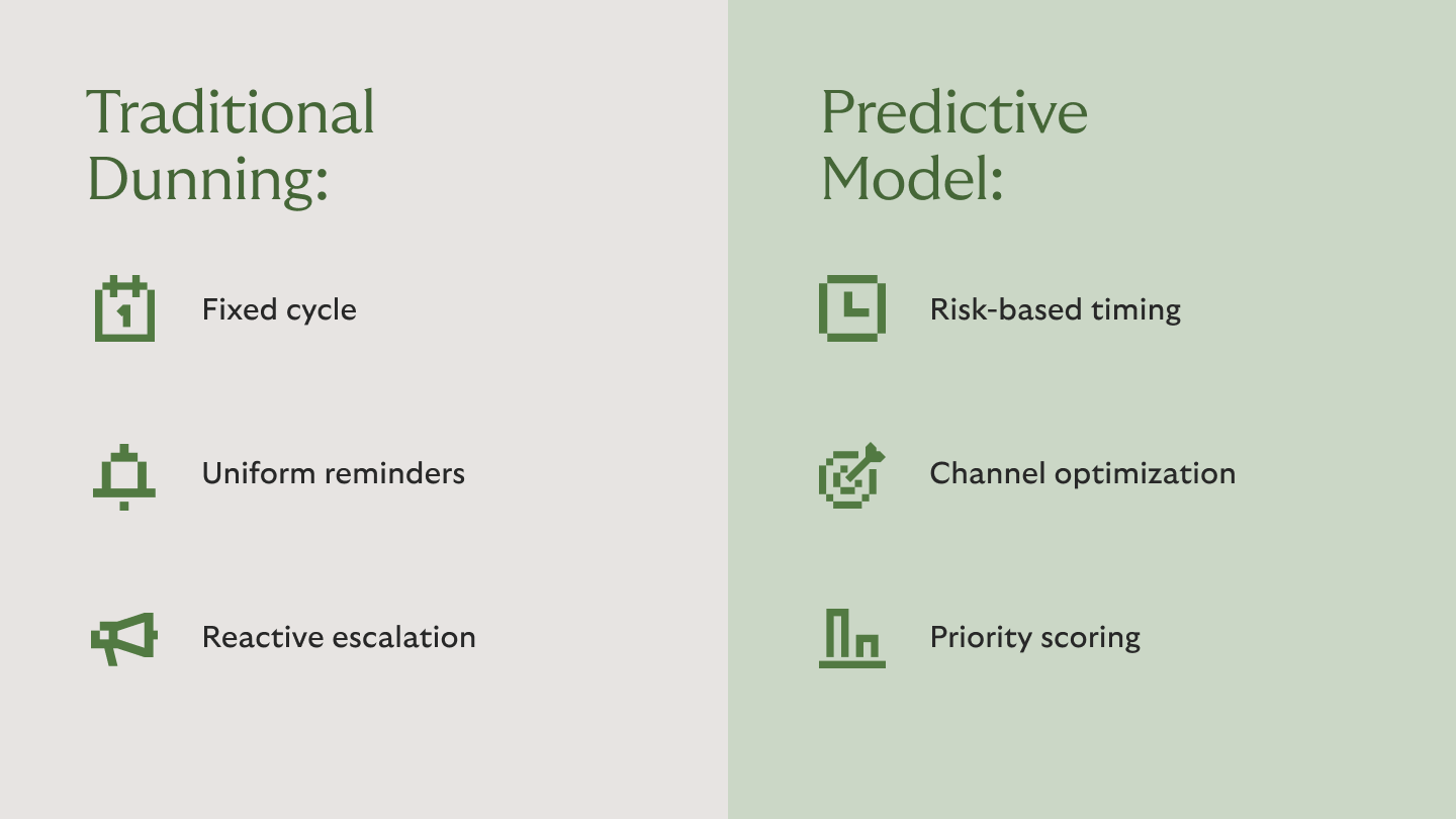 Traditional dunning processes typically follow fixed time intervals and rigid escalation steps. Predictive analytics, on the other hand, helps prioritize measures based on historical patterns and expected response. This applies to timing, channel selection, and communication frequency. As a result, processes become more flexible and adaptive without losing structure. Organizations can focus resources on cases with higher potential while avoiding unnecessary contacts.